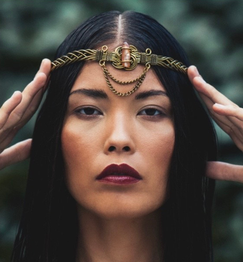 Muévete al son de la música con esta tiara con piedra de cuarzo aura, cadenas de latón y cordón trenzado de eco piel. Esta pieza está hecha a mano y se puede ajustar a cualquier medida