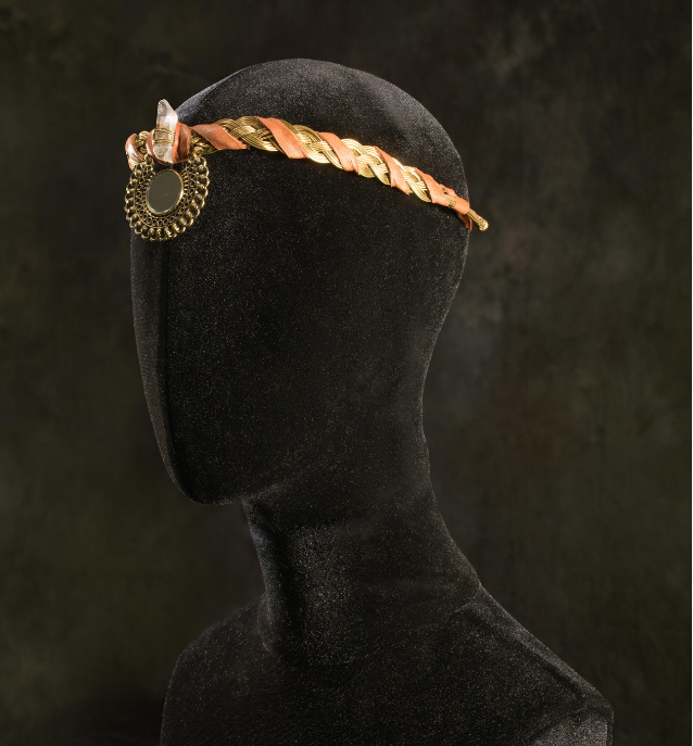 Disfruta del poder de la naturaleza llevando esta tiara dorada con motivo frontal de espejo y tira color camel de piel de vacuno. Esta pieza está hecha a mano y se puede ajustar a cualquier talla.