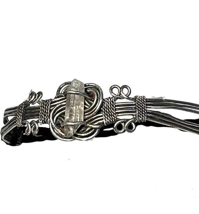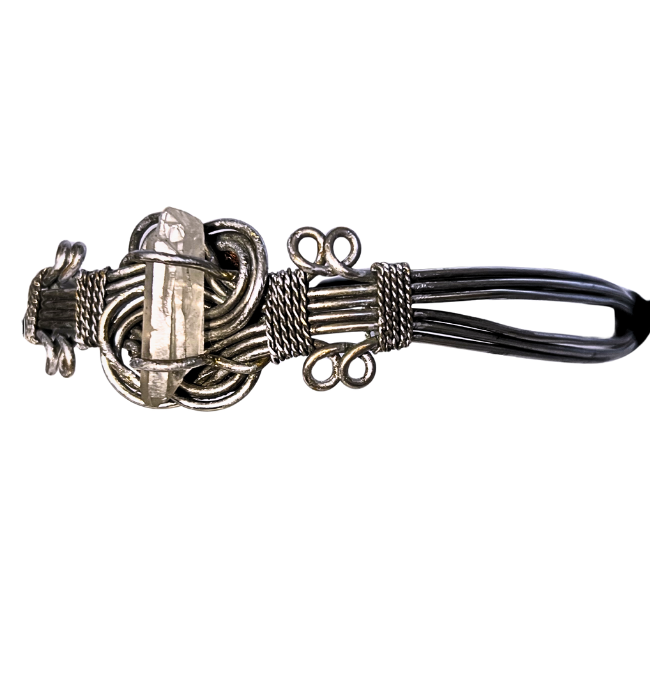 Cuarzo transparente: conocido como “la piedra de la energía universal”. Amplifica la claridad mental, limpia energías negativas y potencia la intuición. Representa pureza, conexión espiritual y equilibrio. Esta pieza está hecha a mano.