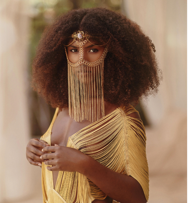 - Cadenas finas cayendo sobre el rostro para un toque exótico y de fantasía